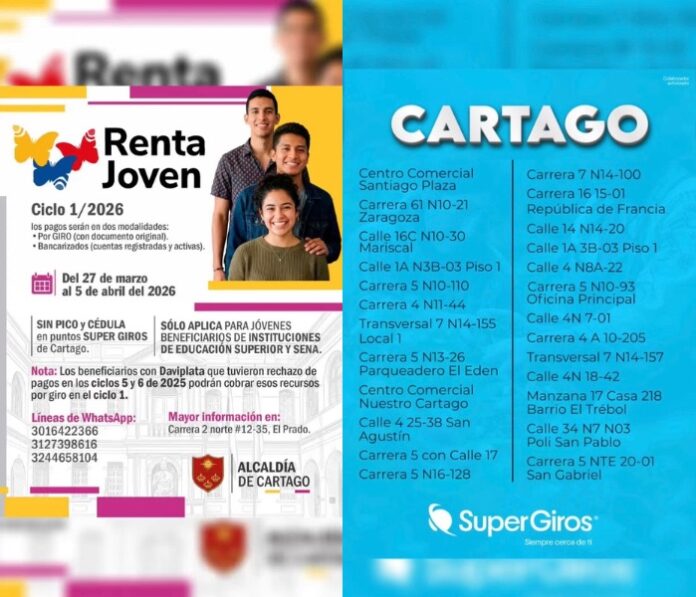 La Alcaldía de Cartago anunció el inicio de los pagos del programa Renta Joven, correspondiente al ciclo 1, en sus modalidades de giro y bancarización.