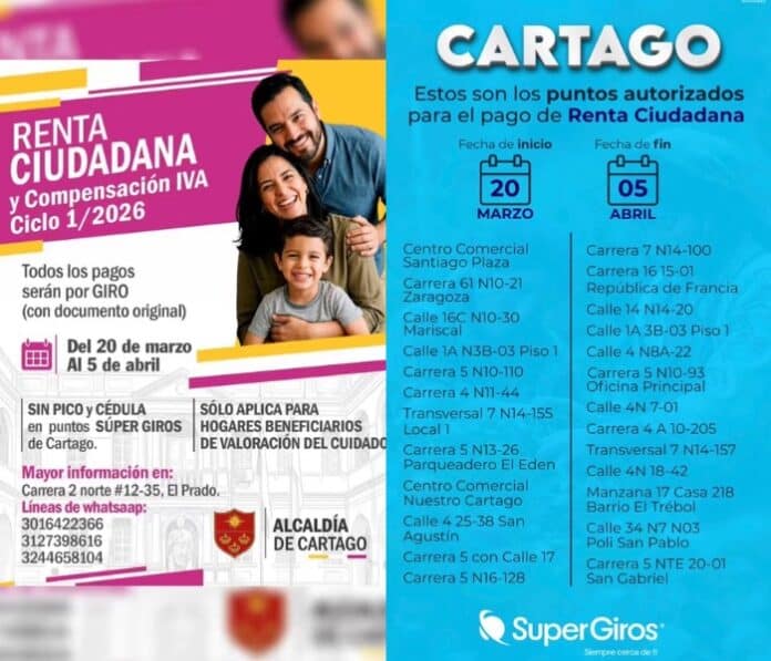 Arrancaron los pagos que muchos estaban esperando en Cartago. La Alcaldía confirmó el inicio del ciclo 1 de 2026 del programa Renta Ciudadana y Compensación del IVA, una ayuda económica que beneficia a miles de familias en condición de vulnerabilidad. Desde ahora, los recursos ya están disponibles y podrán ser reclamados hasta el próximo 5 de abril.