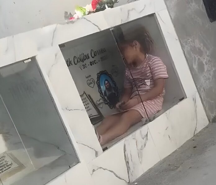 La menor llega con flores y juguetes, como si se tratara de una visita habitual. Sin mostrar temor, abre el nicho e ingresa en él, comportándose como si aún compartiera con su madre. Dentro, habla en voz baja, juega y sonríe, en una escena que refleja una conexión emocional que parece intacta.